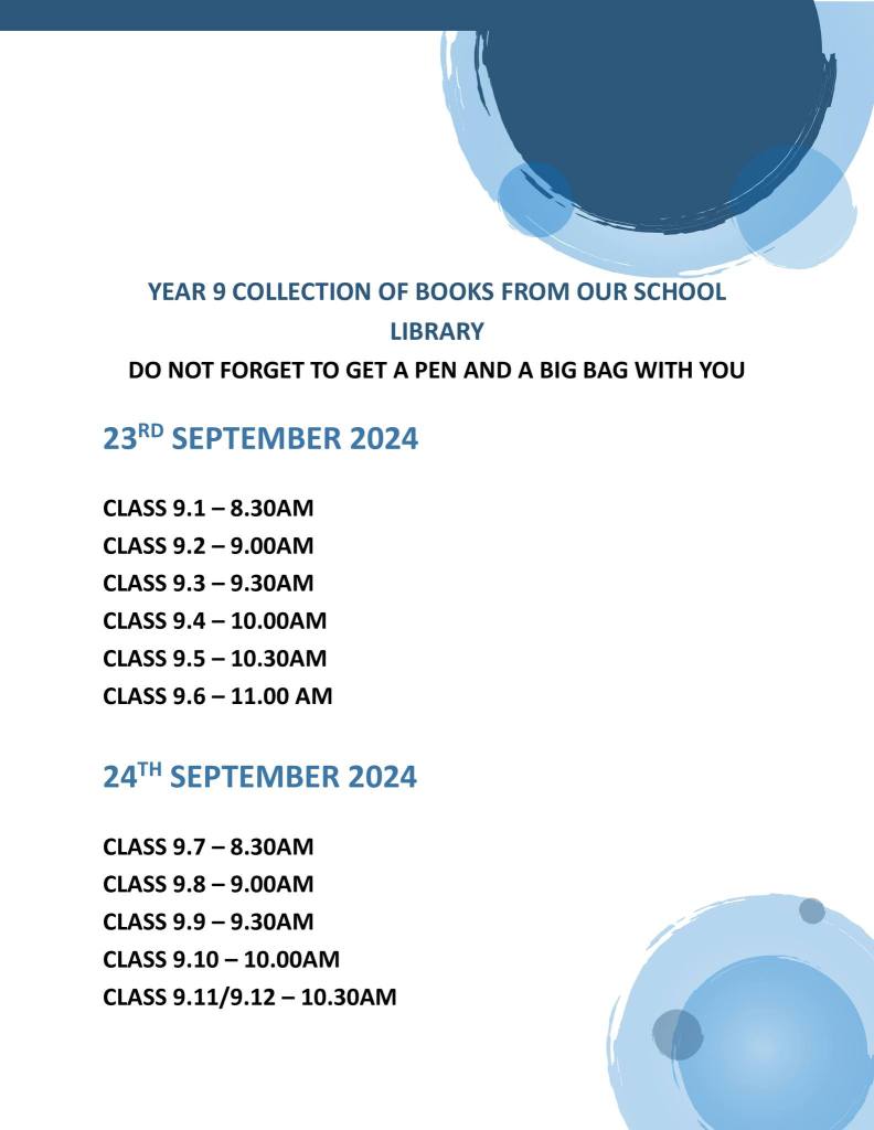 Time table of Year 9’s Collection of Books. This has also been sent by email.
