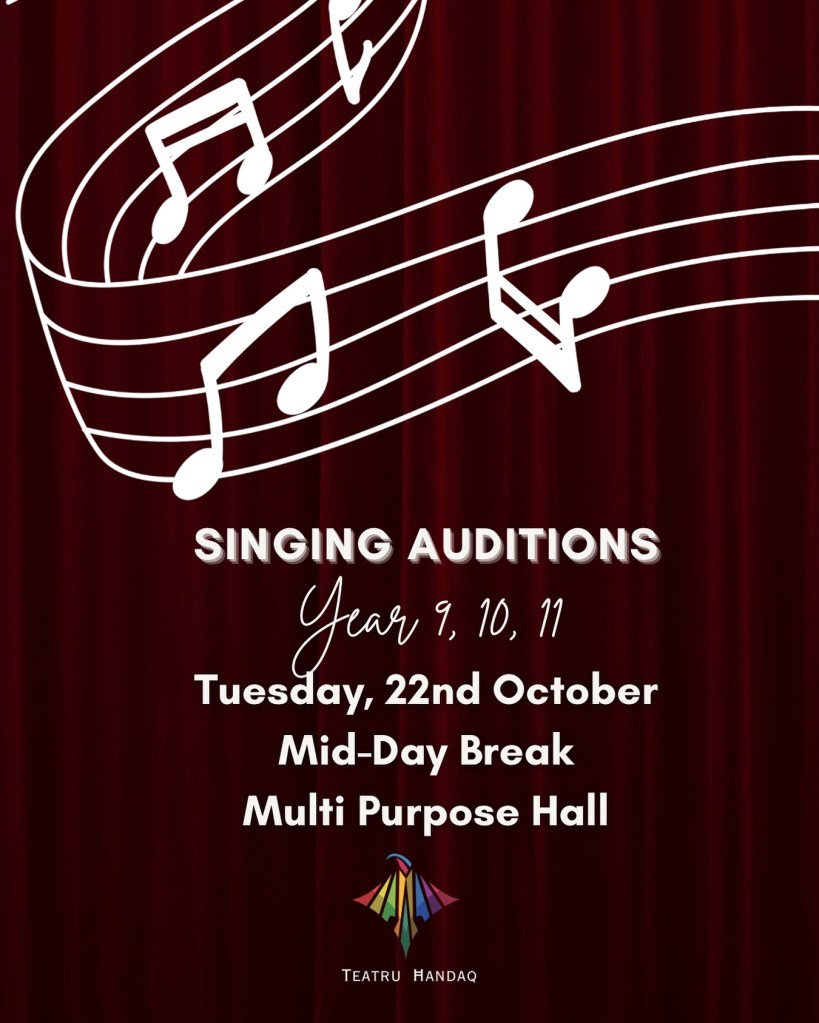 SINGING AUDITIONS for Year 9, 10 & 11 will take place on Tuesday 22nd October in the Multipurpose Hall. Please prepare one of the below songs: