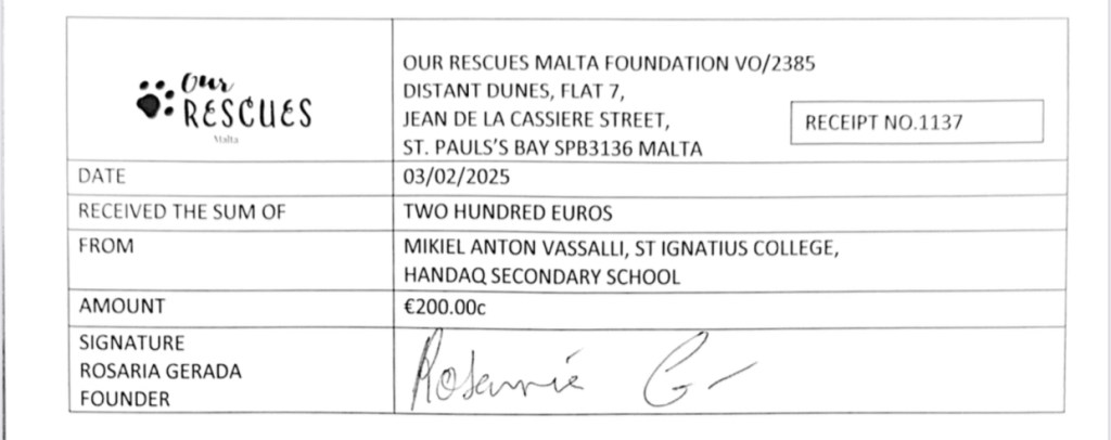 On Monday 3rd February, the Year 9 students had a special assembly. During this assembly, the students had a talk from Ms Althea Galea who represented the NGO Our Rescues Malta Foundation. Ms Galea emphasized the importance of treating animals with kindness and responsibility. Students learned about the challenges faced by rescue organizations and how they can contribute, whether by adopting pets, volunteering, or spreading awareness. This talk left everyone with a deeper appreciation for animal welfare and a renewed sense of responsibility towards our furry friends. At the end of this activity, the Head of School, Mr Bernardo Riolo presented a monetary donation of €200 to this NGO. This money was raised through a bake sale held a few weeks ago, organised by the King’s Trust Department.