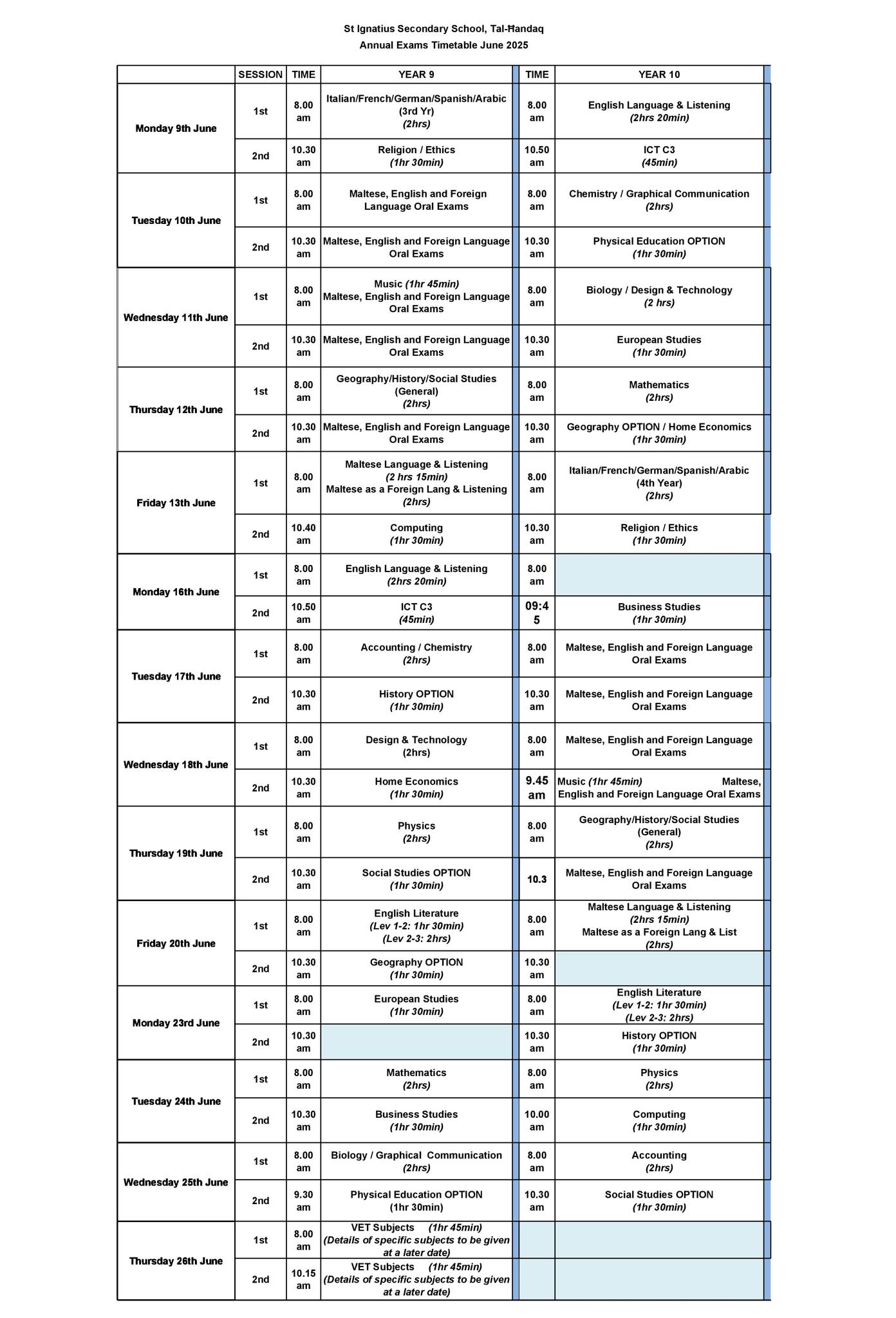 Annual Exams – JUNE 2025 TIMETABLE