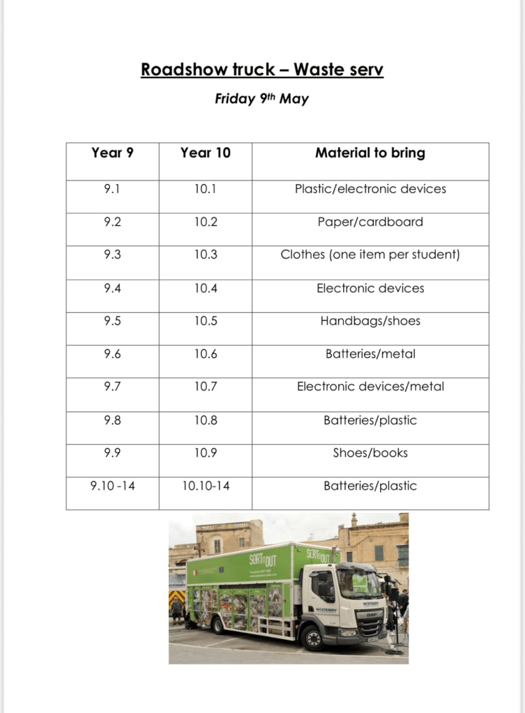 On Friday 9th May, the Wasteserv Roadshow truck is coming to our school. The aim is to raise more awareness about waste separation. As from Monday 5th May, every student can bring an item according to his/her class schedule (kindly refer to the table attached). There will be deposit boxes in Foyer 0 where students can place the product that they brought. There will be 7 deposit boxes: clothes; bags & shoes; electronic devices; plastic; paper & cardboard; batteries and metal.