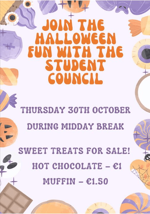 During the midday break, our Student Council members will be selling delicious muffins and hot chocolate ā the perfect treat for a cozy, spooky day! ![]()