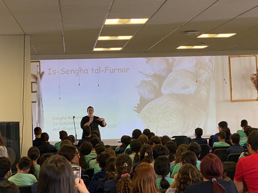 Wednesday 12th November was all about Maltese bread. During a special assembly, Ms R. Aquilina delivered an informative presentation on bread-making. Later, students enjoyed a delicious ftira biĹĽ-ĹĽejt during the midday break.