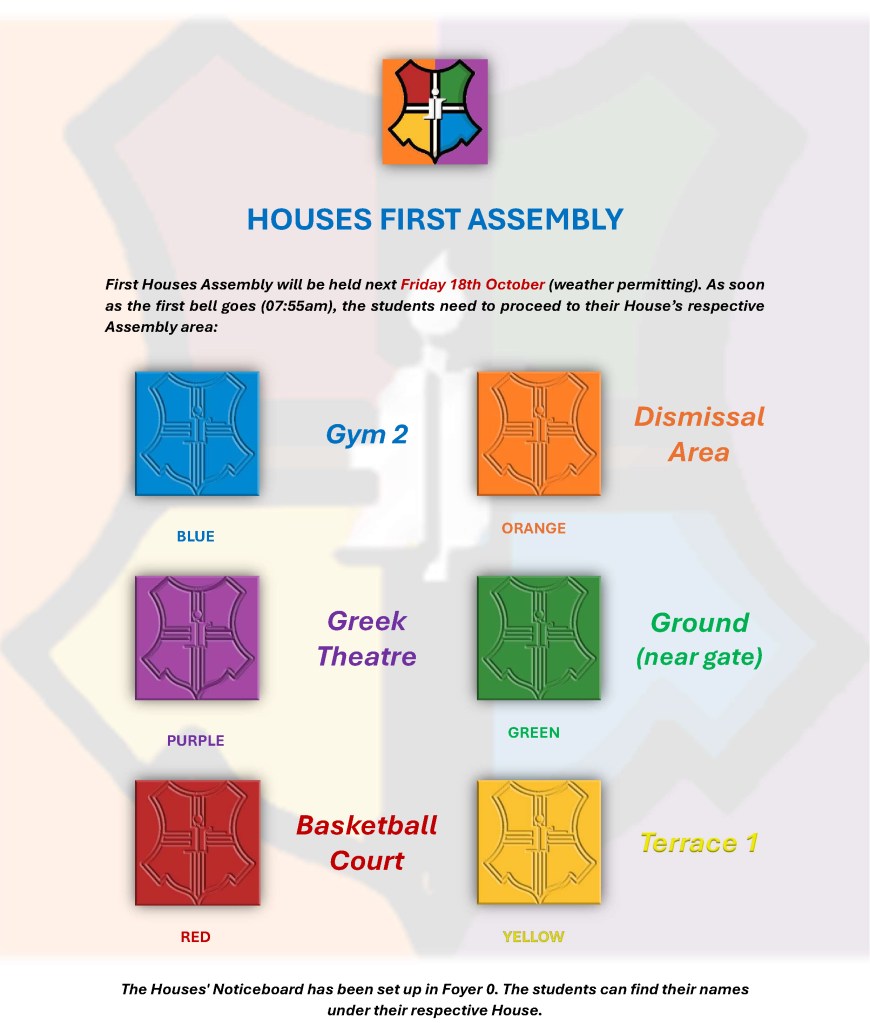 The Houses’ first Assembly will be held next Friday 18th October (weather permitting). As soon as the first bell goes (07:55am), the students need to proceed to their House respective Assembly area as illustrated below: