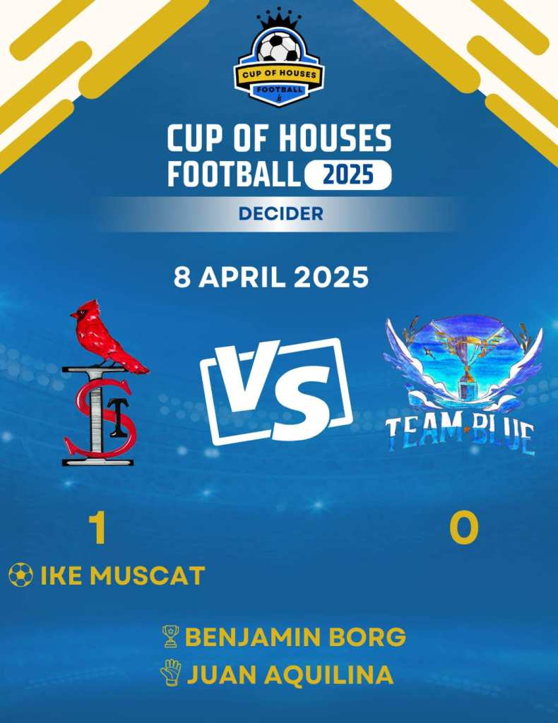 The Reds are crowned champions of the Football League after a hard fought match.The Red house managed to score the only goal of the game through Ike Muscat’s strike in the first half. The blues fought hard to grab the equaliser but were denied by a great performance from Juan Aquilina. A man of the match performance by Benjamin Borg helped the Reds to win the cup. Well done to both teams for a highly contested match.