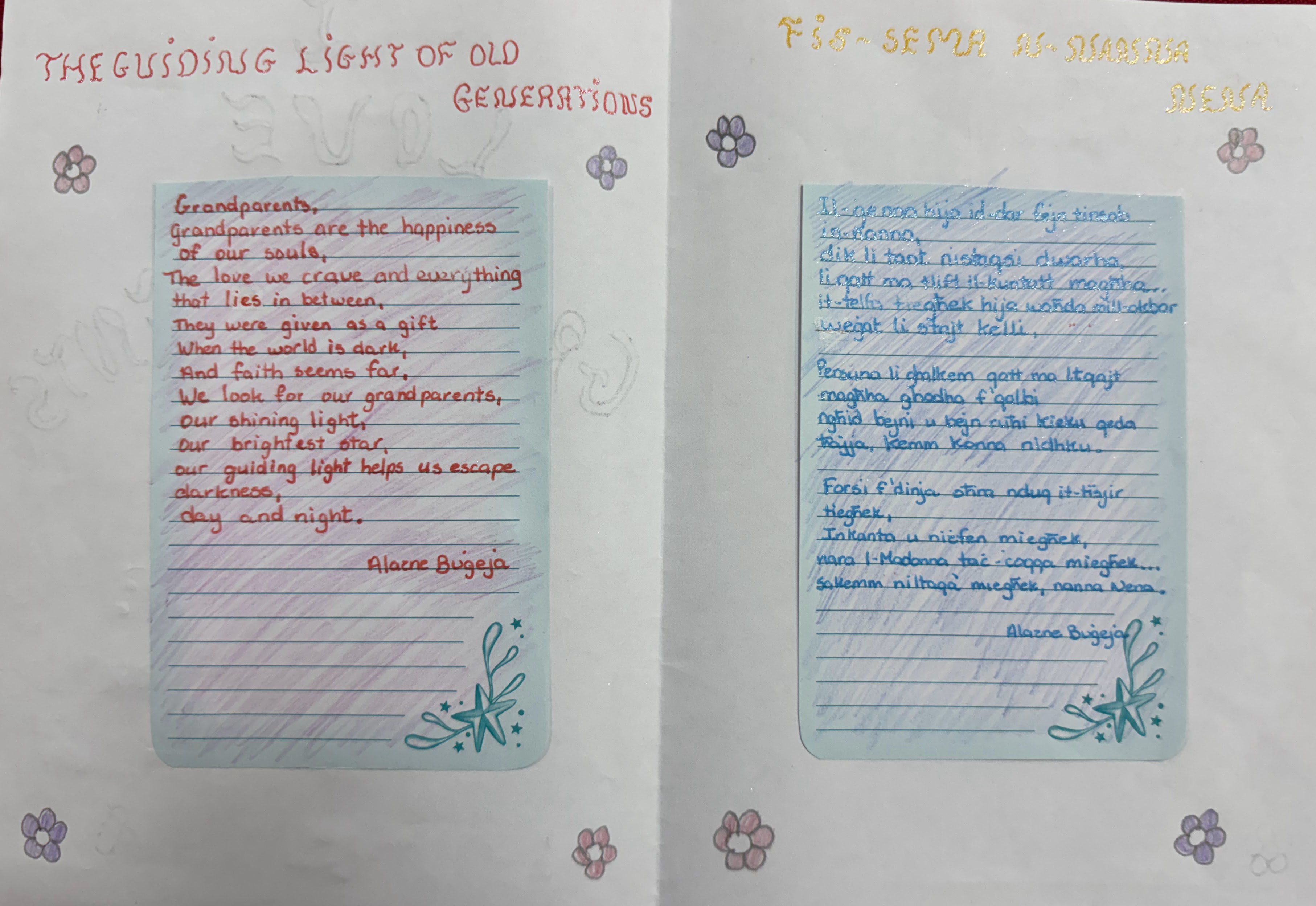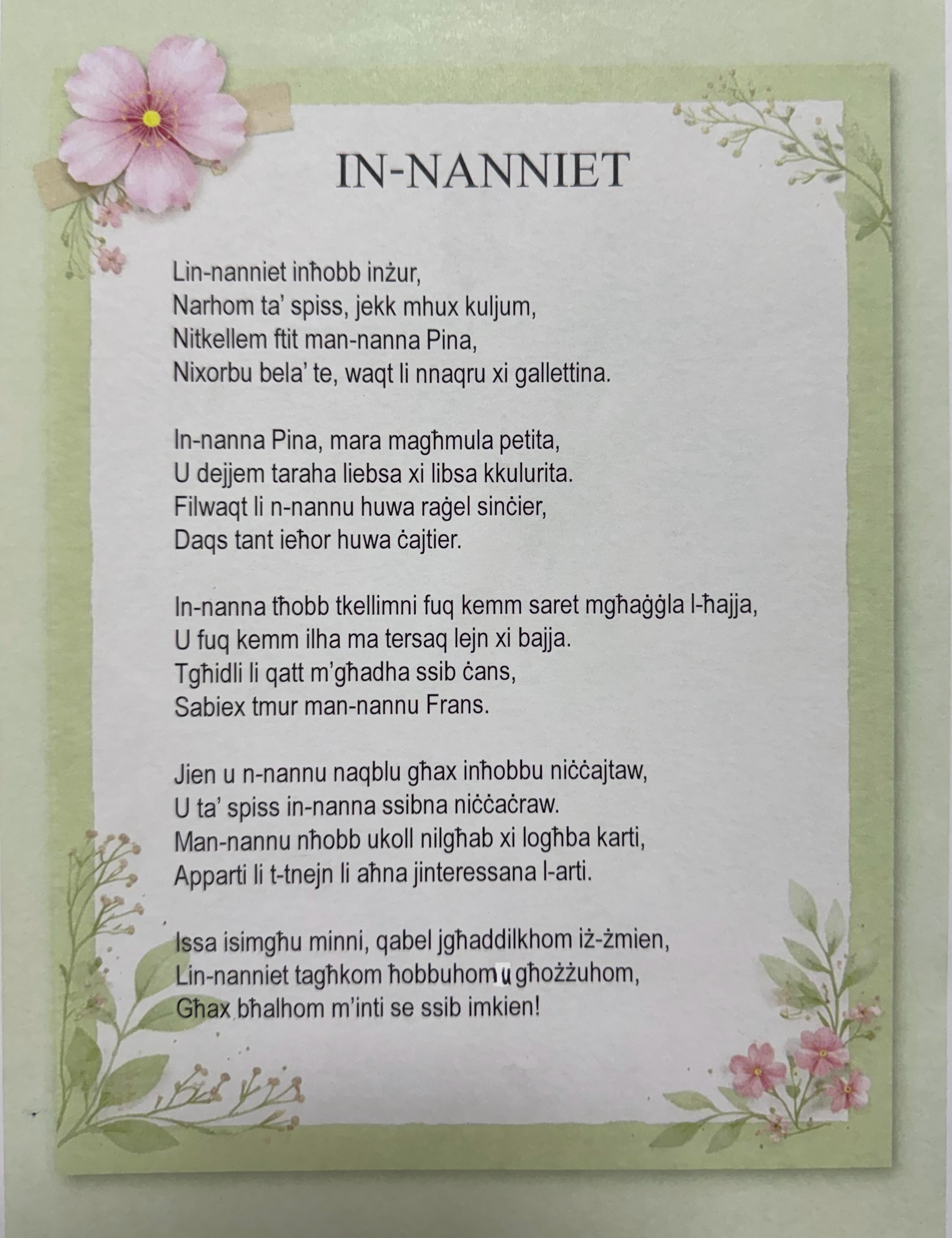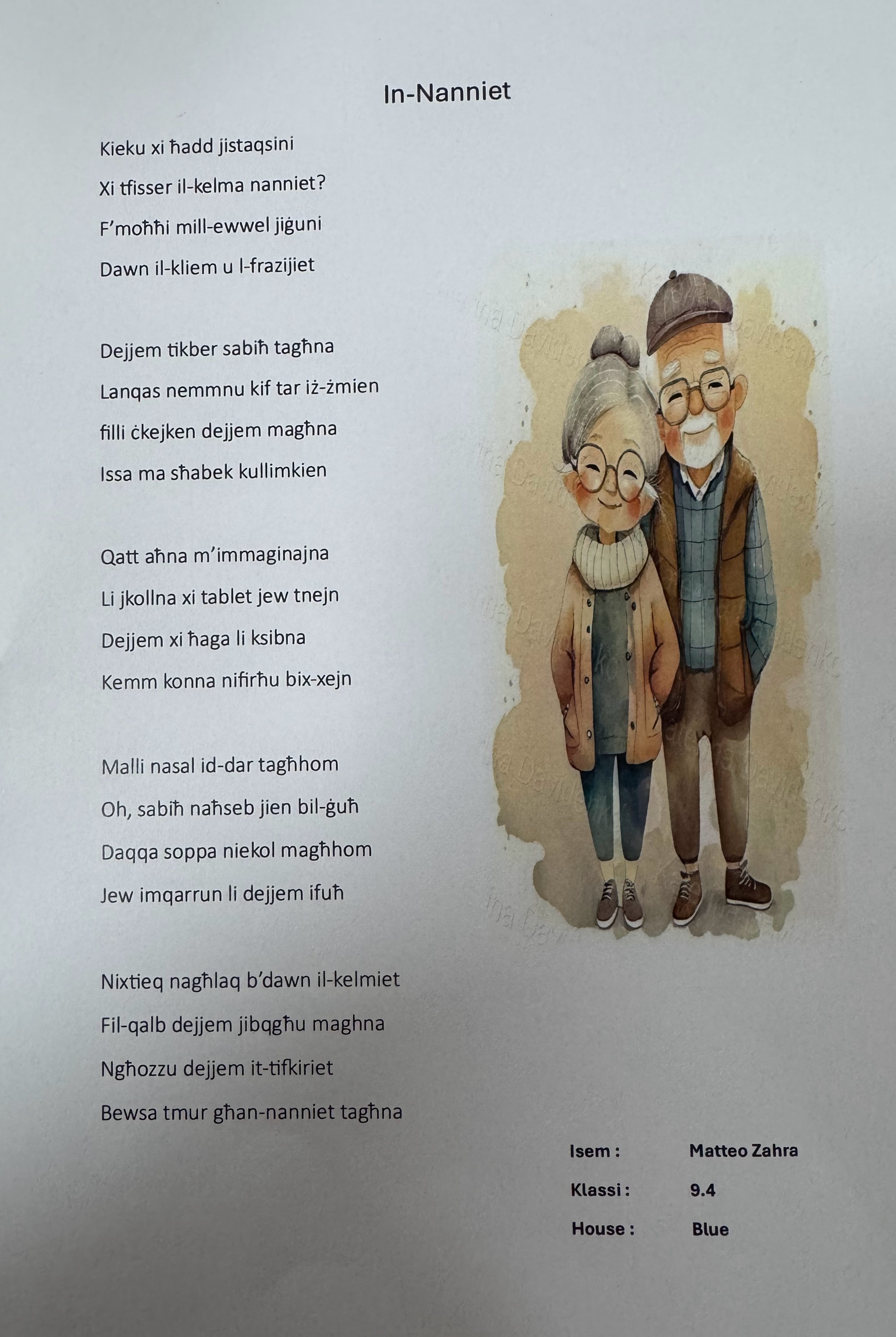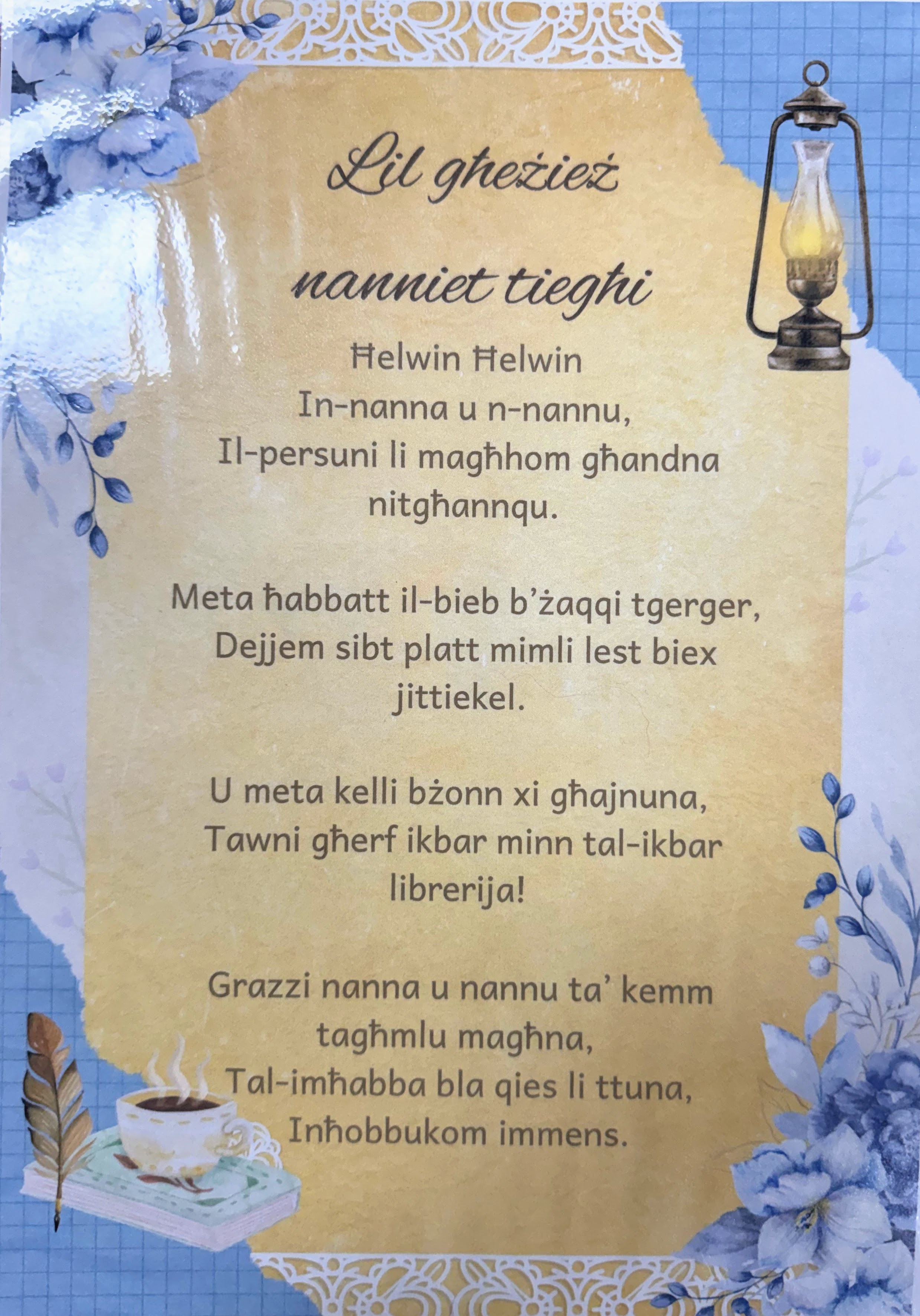 🇲🇹 Prosit kbira lill-istudenti poeti tagħna li pparteċipaw fil-kompetizzjoni tal-poeżija bit-tema tan-nanniet. Bi pjaċir inħabbru r-rebbieħa ta’ din il-kompetizzjoni, fejn iċċelebrajna l-għożża u l-għerf tan-nanniet. Ix-xogħlijiet li ġew preżentati missew il-qlub ta’ dawk li qrawhom u fakkruna lkoll fir-rabta speċjali li għandna man-nanniet tagħna.